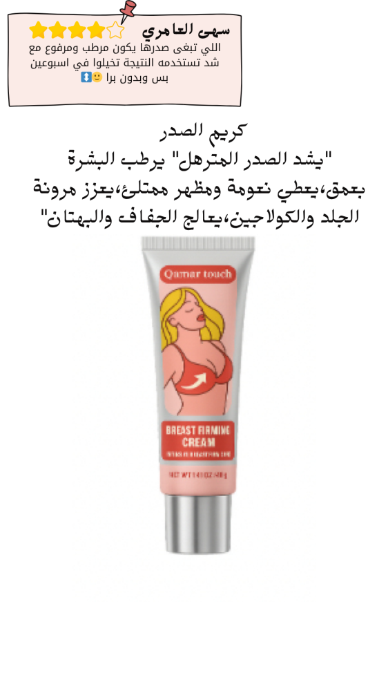كريم الصدر "يشد الصدر المترهل" يرطب البشرة بعمق،يعطي نعومة ومظهر ممتلئ،يعزز مرونة الجلد والكولاجين،يعالج الجفاف والبهتان"